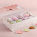 A refreshing summer mochi box with 8 pieces of mochi ice cream - 2 each of Razizu, Watermelon, Caramel Miso, and Peach